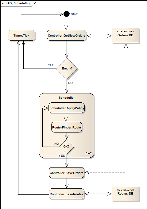 Scheduler naplánuje objednávku do určité trasy. Use cases: UC1 UC2 UC6