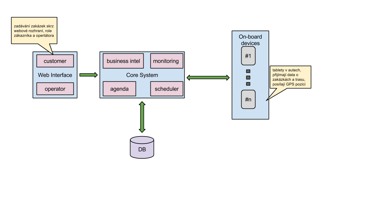 Cílem je vytvořit software, který bude firmě zabývající se autodopravou řešit běžnou agendu. Bude spravovat vozový park a seznam zaměstnanců (řidičů), dále pak poskytovat službu automatického dispečera (resp. v jazyce logistiky - "disponenta"), tedy bude přidělovat trasy jednotlivým autům a snažit se optimalizovat jejich vytížení. Trasy bude cetrální dispečink posílat autům přímo do navigace. V neposlední řadě bude k dispozici webové rozhraní pro zadávaní nových zakázek, které budou moct využívat jakt koncoví klienti, tak i operátoři přijímající zakázky po telefonu.